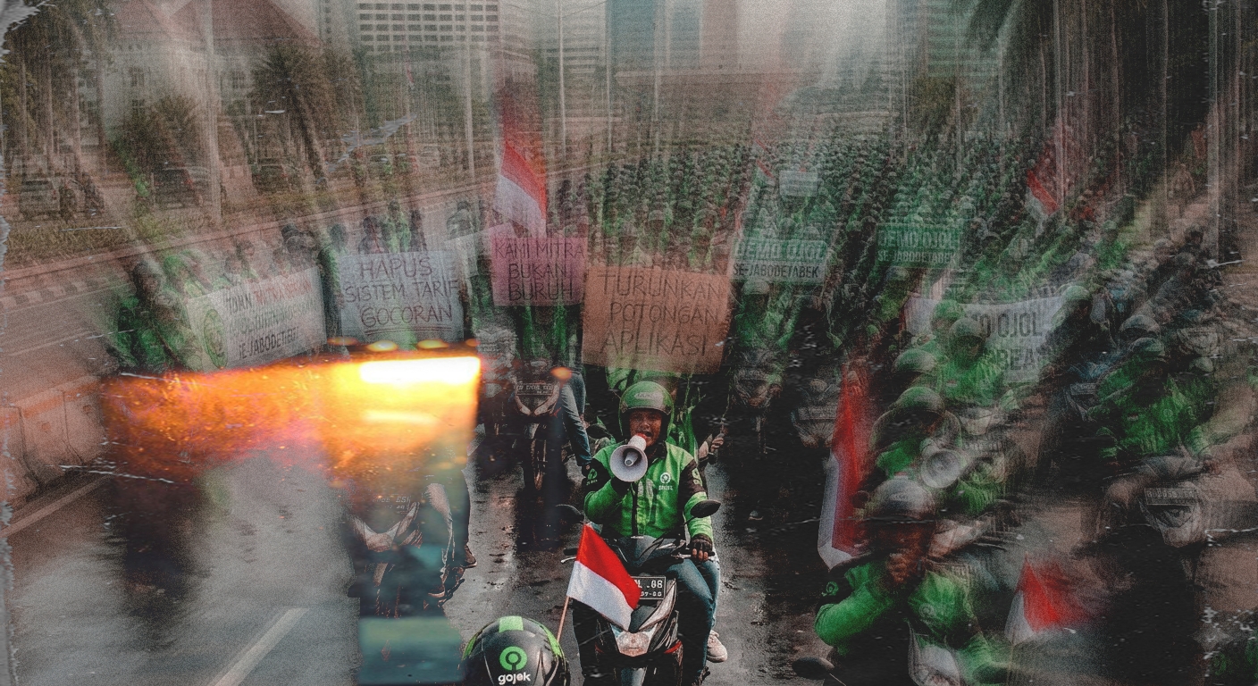 Para peserta aksi tampak kompak mengenakan atribut khas ojol berwarna hijau dan kuning. Sejumlah bendera komunitas juga dikibarkan, memperlihatkan solidaritas antar pengemudi dari berbagai kelompok.